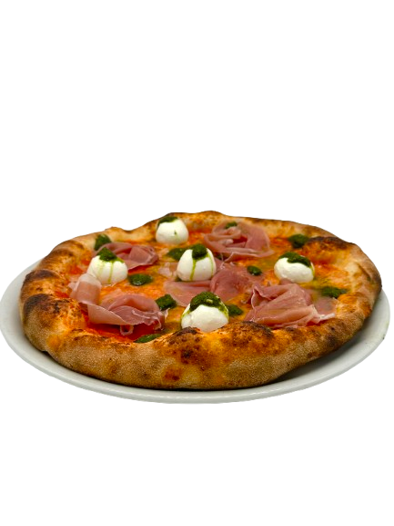 19,50€Tomaten, Mozzarella, San-Daniele Parmaschinken, Büffel-Bocconcini, Basilikum-Pesto